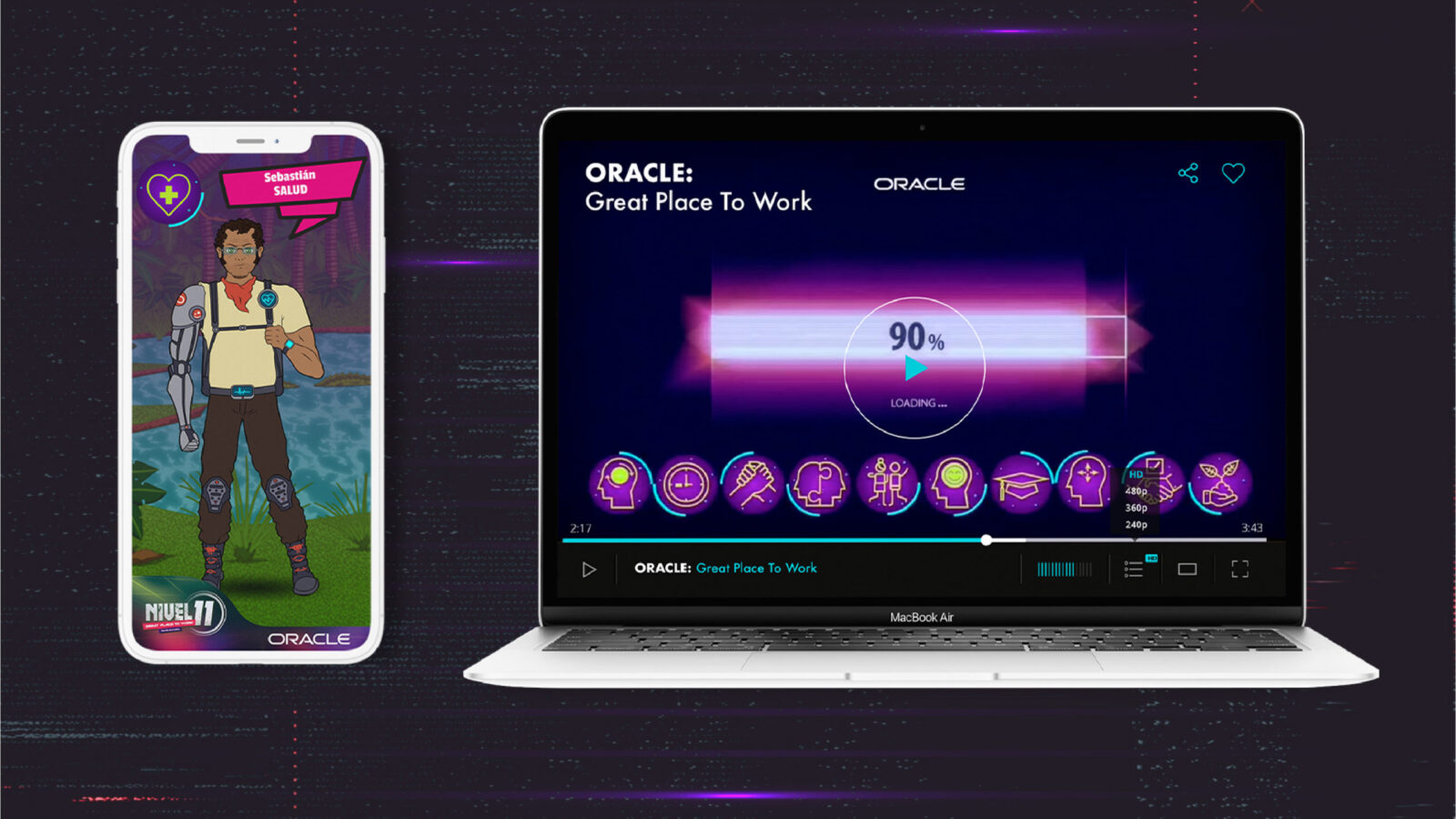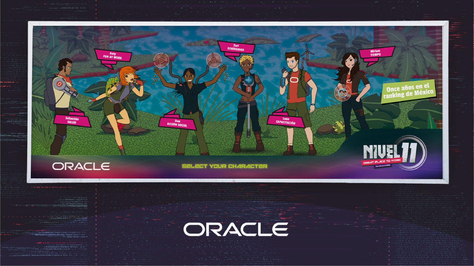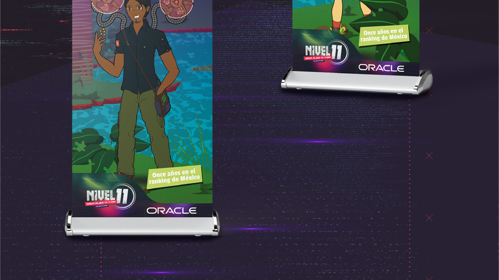 En proyecto en particular se diseñó toda una identidad basada en el concepto Nivel 11, que hace referencia a los años que Oracle México lleva siendo parte del ranking Greatr Place to Work en México. Un proyecto llevado desde el brief, que se centró en la generación de personajes que identificaran en lo posible a todos los empleados de Oracle México. El resultado logrado es una campaña con un alto ipmácto visual y de identidad corporativa.